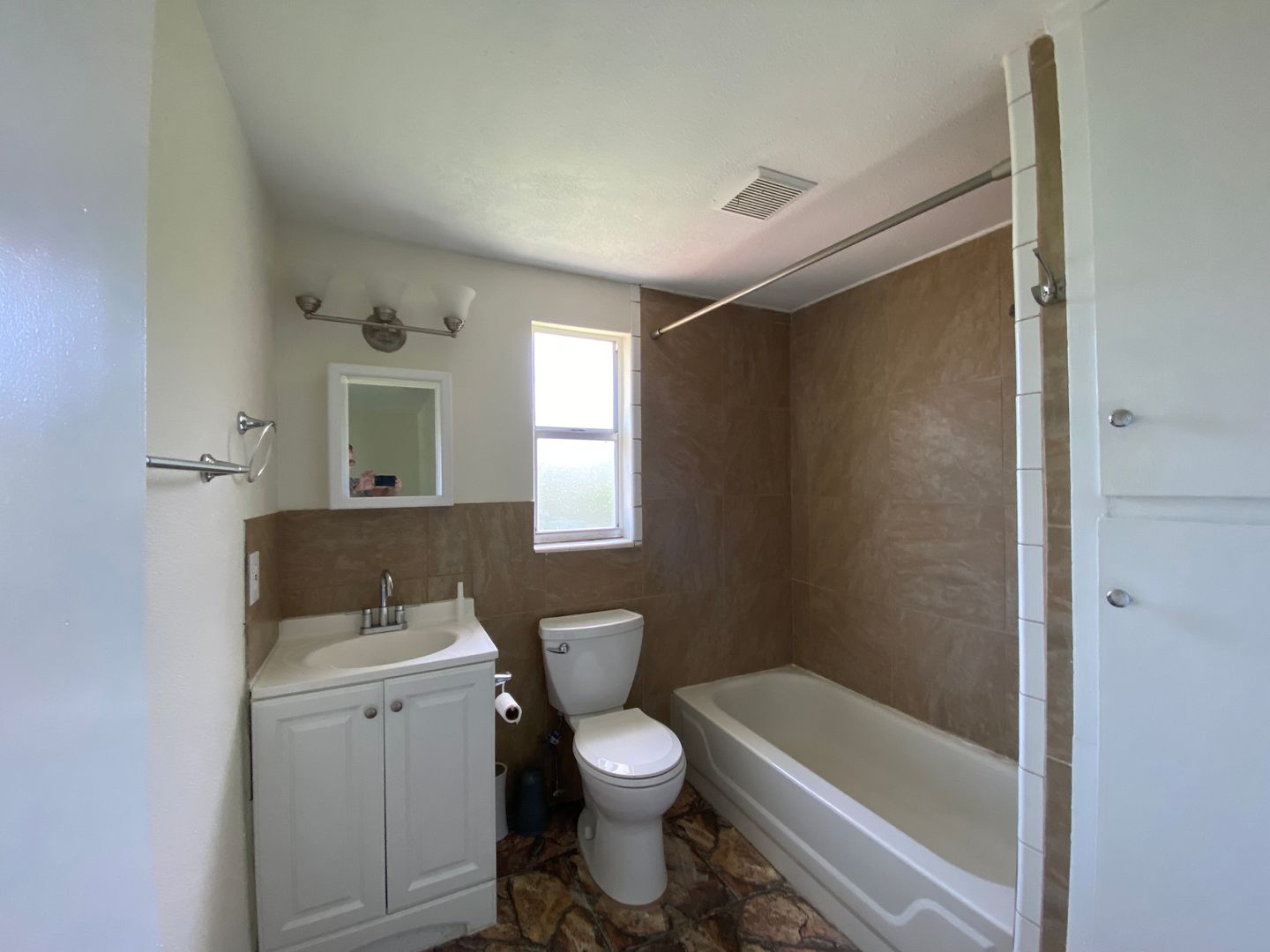 Bathroom: A clean and well-maintained bathroom offers a shower and bathtub combination, a vanity with storage, and a mirror.